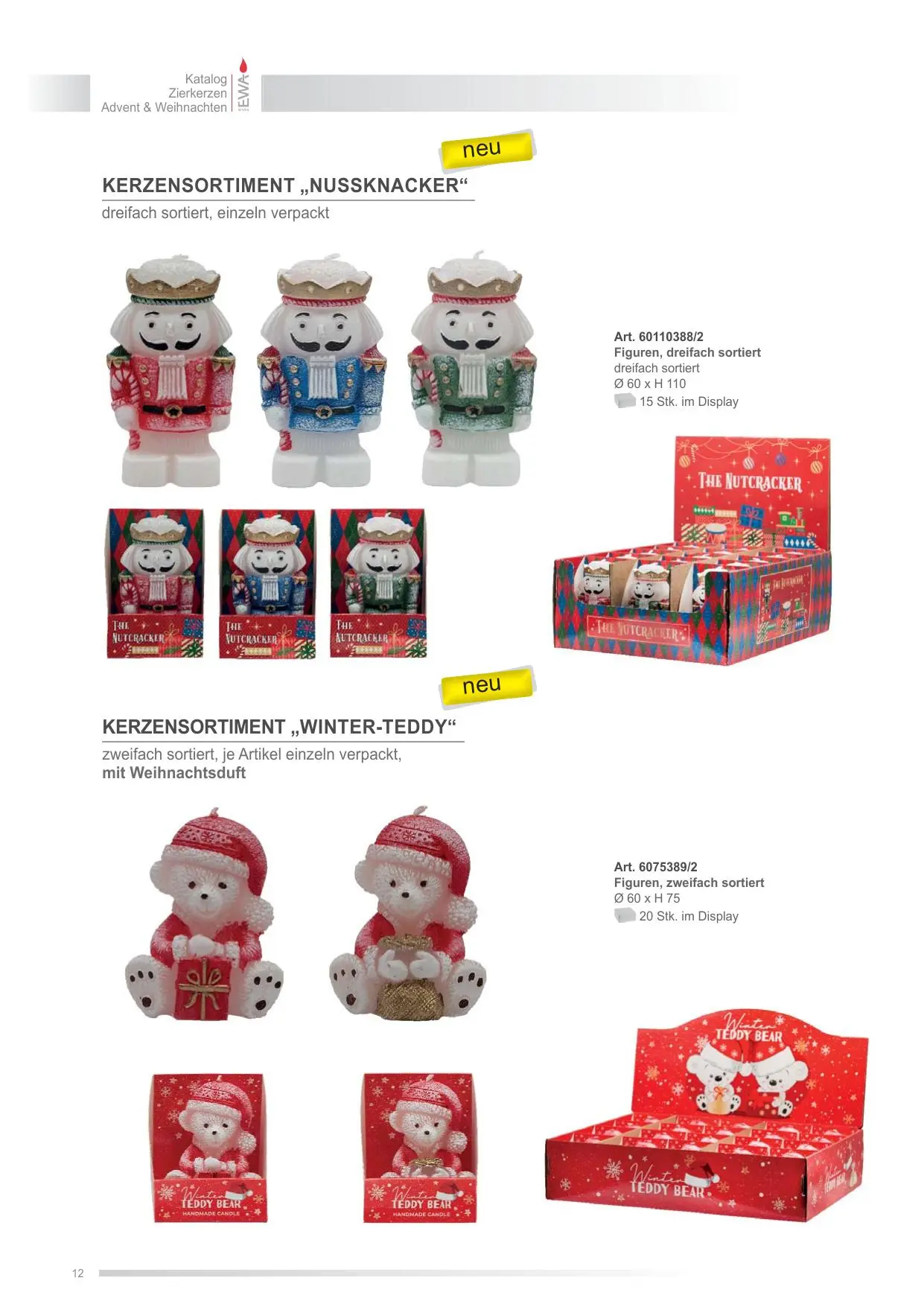 Katalog Zierkerzen Advent & Weihnachten neu KERZENSORTIMENT „NUSSKNACKER“ dreifach sortiert, einzeln verpackt Art. 60110388/2 Figuren, dreifach sortiert dreifach sortiert Ø 60 x H 110 15 Stk. im Display neu KERZENSORTIMENT „WINTER-TEDDY“ zweifach sortiert, je Artikel einzeln verpackt, mit Weihnachtsduft Art. 6075389/2 Figuren, zweifach sortiert Ø 60 x H 75 20 Stk. im Display 12