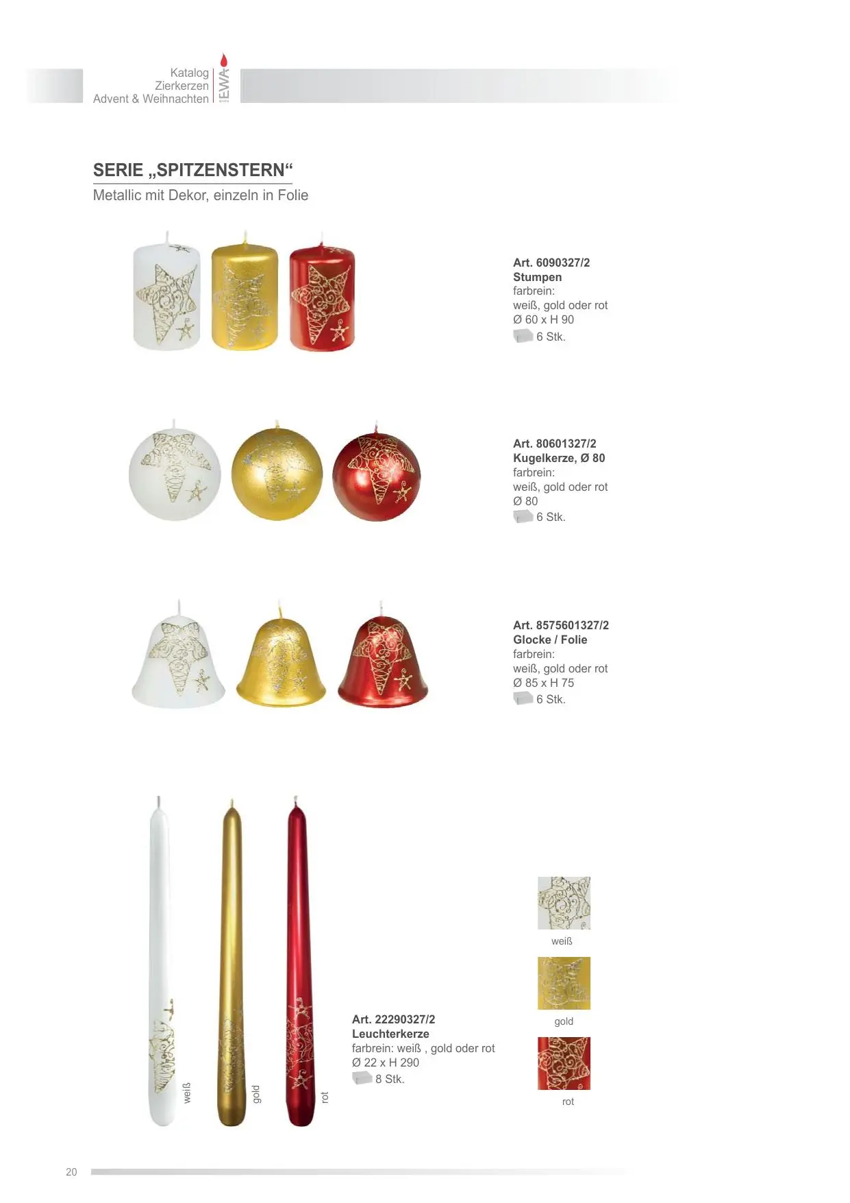 Katalog Zierkerzen Advent & Weihnachten SERIE „SPITZENSTERN“ Metallic mit Dekor, einzeln in Folie Art. 6090327/2 Stumpen farbrein: weiß, gold oder rot Ø 60 x H 90 6 Stk. Art. 80601327/2 Kugelkerze, Ø 80 farbrein: weiß, gold oder rot Ø 80 6 Stk. Art. 8575601327/2 Glocke / Folie farbrein: weiß, gold oder rot Ø 85 x H 75 6 Stk. 20 Art. 22290327/2 Leuchterkerze farbrein: weiß , gold oder rot Ø 22 x H 290 8 Stk. rot gold weiß weiß gold rot